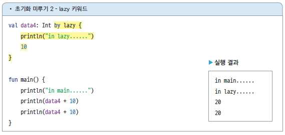 - by lazy { } 형식으로 선언하며, 소스에서 변수가 최초로 이용되는 순간 중괄호로 묶은 부분이 자동으로 실행되어 그 결과값이 변수의 초기값으로 할당된다.